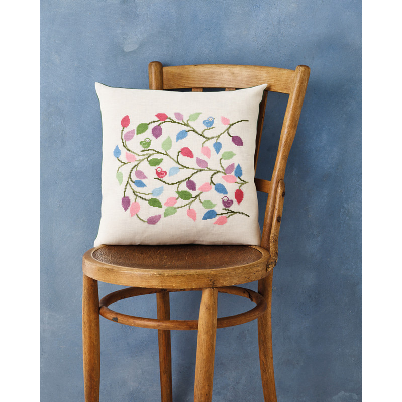Brodera en kudde med ett små fåglar och löv i många färger. Kudden broderas på linneväv med 10 trådar per cm. Kitet innehåller moulinégarn, väv, mönster och nål.