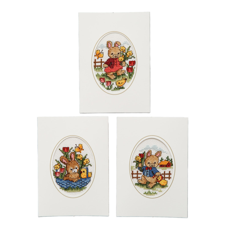 Brodera tre påskkort med söta harar på.