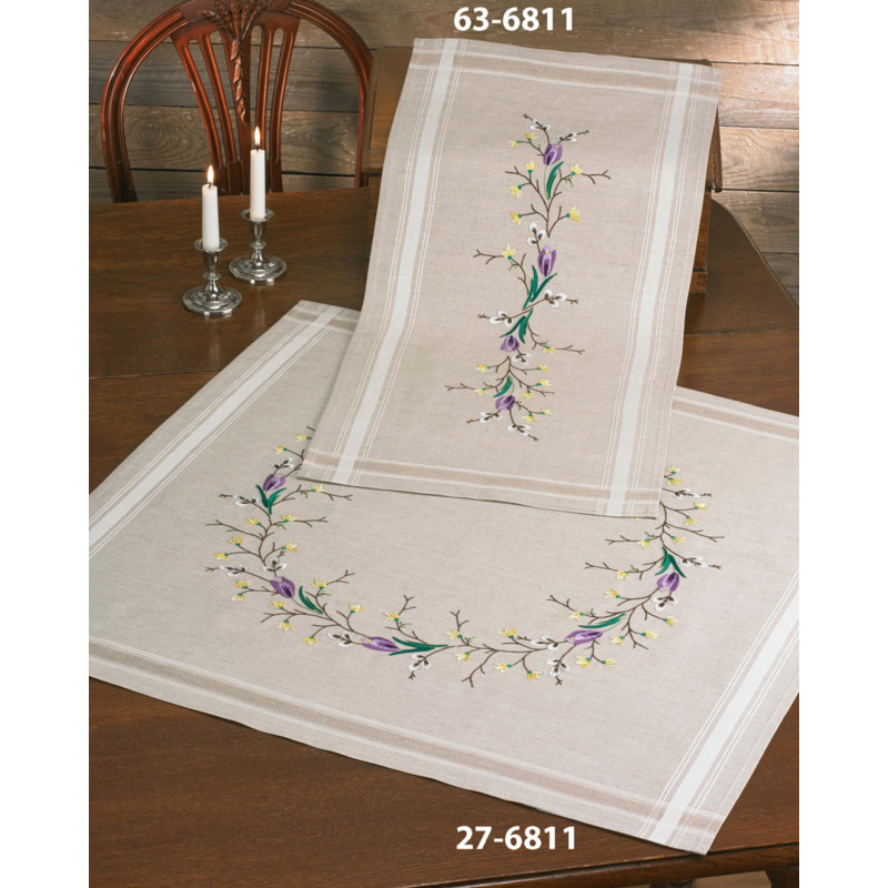 Brodera en duk med vårblommor i plattsöm, stjälkstygn mm. Kitet innehåller: Fållad duk med ritat mönster, nål, garn och mönster.